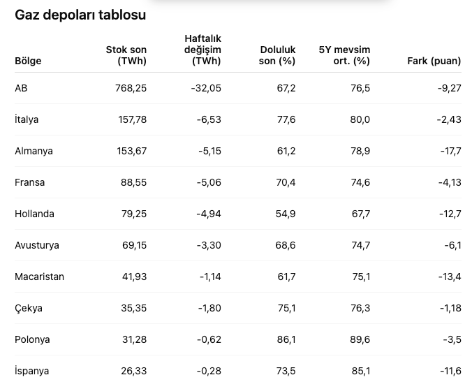 Gas Infrastructure Europe verisine göre stoklar 20 Aralık 2025 haftasında 157,8 teravat-saat oldu.